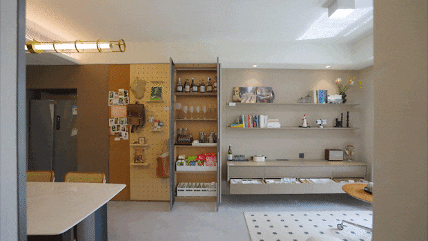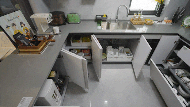 洗碗机为方太高端系列。软木墙能够贴上回忆照片或者每日备忘录。洞洞板的护杆能够按照凹凸分歧随便调理,操纵垂曲空间把收纳做到了极致,