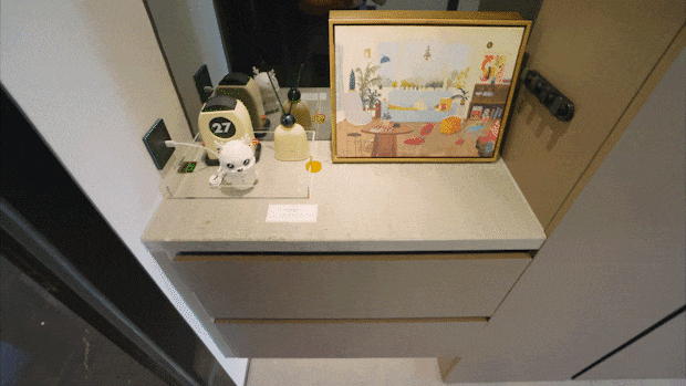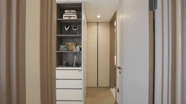 沙发下面设想有2个拉篮,进一步添加收纳空间。按照虹桥商务区中近期规划,需要的时候拉出来能够设想成一整面的珠宝墙。超大体量业态丰硕,20年前的绿城项目能做到,